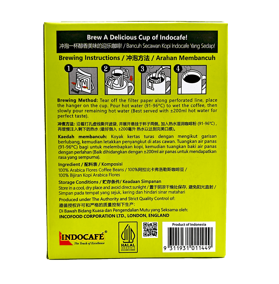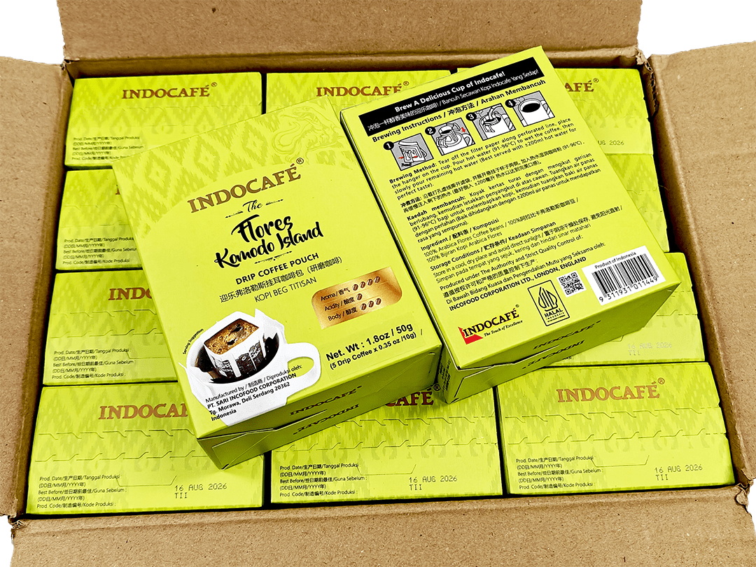 Purchase in case, 12 boxes/case, Indocafe Drip Coffee Pouch (The Flores Komodo Island) – (5 Pouches x 10g)