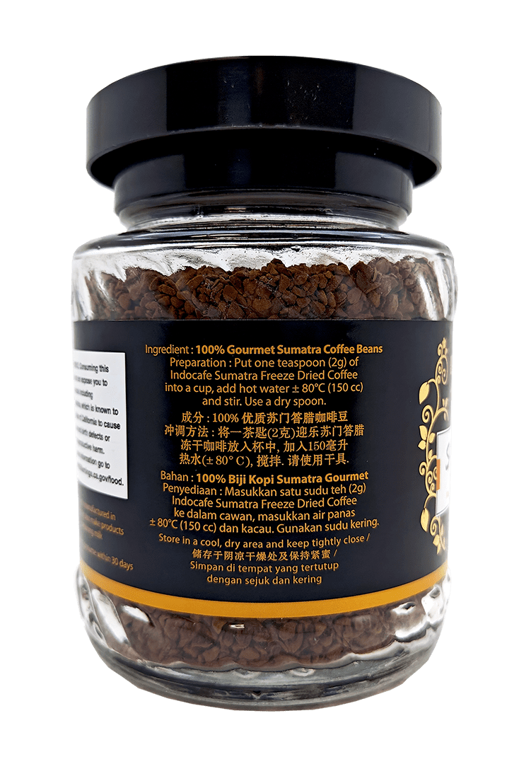 Indocafe presents Indocafe Sumatra Freeze Dried Coffee, skillfully crafted using handpicked authentic Arabica and Robusta coffee beans of Sumatra Island origin. To produce this premium instant coffee, we freeze-dried our signature blend to encapsulate the original flavour of our select coffee beans. Through each sip of Indocafe Sumatra Freeze Dried Coffee, your palate will be greeted with warming coffee aroma, complimented pleasantly with natural notes of mocha and chocolate. With medium-strong body with subtle acidity and clean aftertaste, immerse your senses in the rich flavors of Indocafe Sumatra Freeze Dried Coffee.
